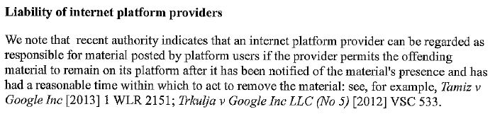 Under the bold heading “Liability of internet platform providers” Clark and Lee referred to two recent court cases, namely Tamiz v Google and Trkulja v Google, and said,