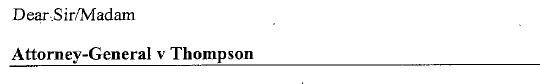 This subject line, “Attorney-General v Thompson”, overtly represented to my Internet content host that there was a legal dispute or proceeding on foot between the Attorney General and myself and that the letter to my Internet content host was legitimately sent in respect to that current dispute.