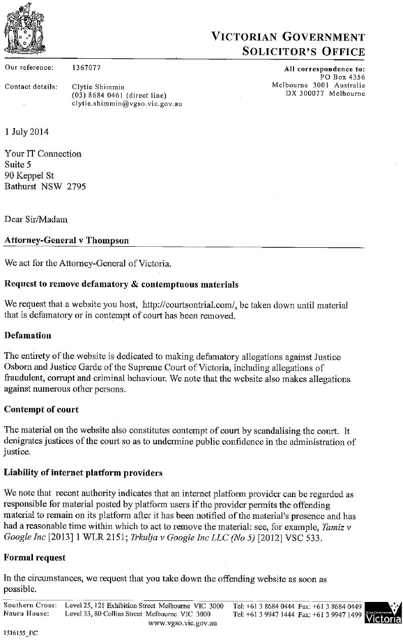 In that letter, under colour of office of Attorney General and of the Victorian Government Solicitor you intended to and have wrongfully intimidated my web host, IT Connections, and requested/required IT connections to “take down” my website http://courtsontrial.com until (unspecified) material that is (alleged by you and the VGSO) to be defamatory or in contempt of court has been removed.