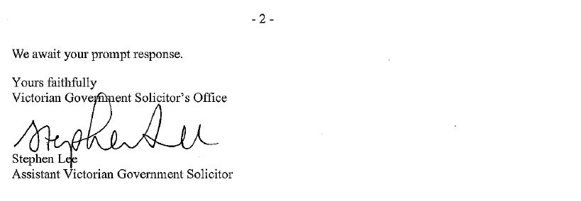 I have been provided with a copy of a letter from Stephen Lee of the Victorian Government Solicitors Office, purportedly issued under instruction from yourself.