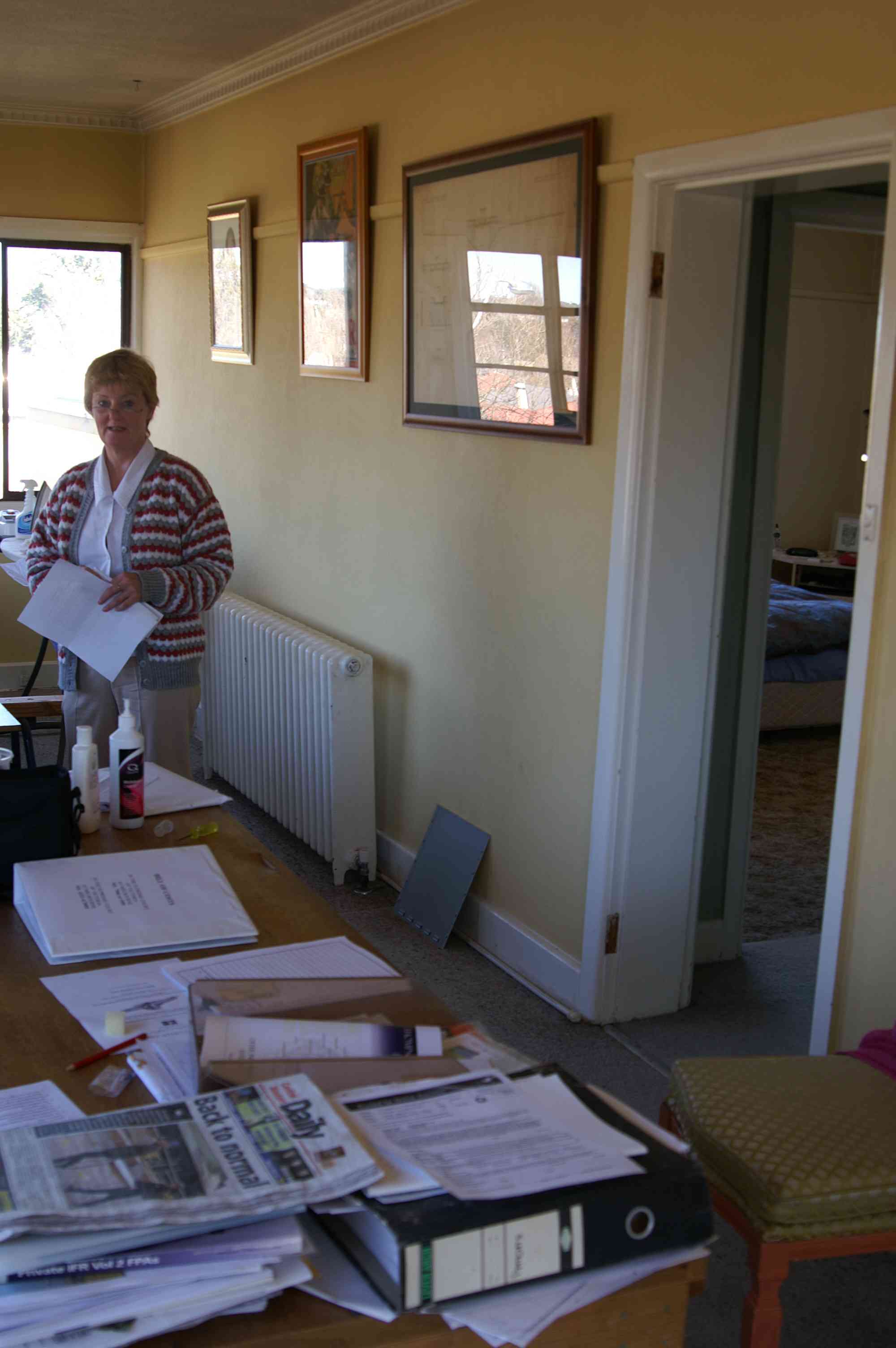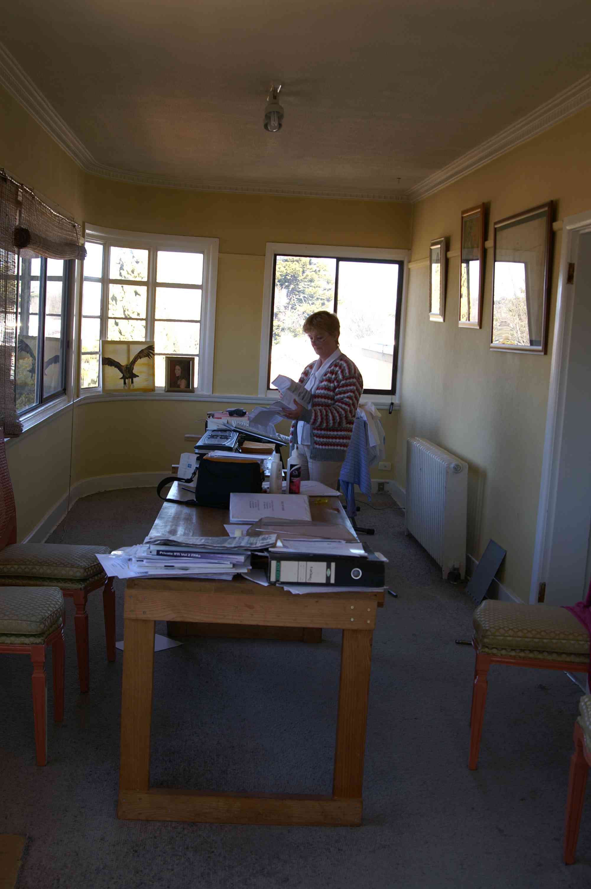 - My front room looking south. The woman is standing where Mr. Edward's copier was set up. Two trestle tables are present.