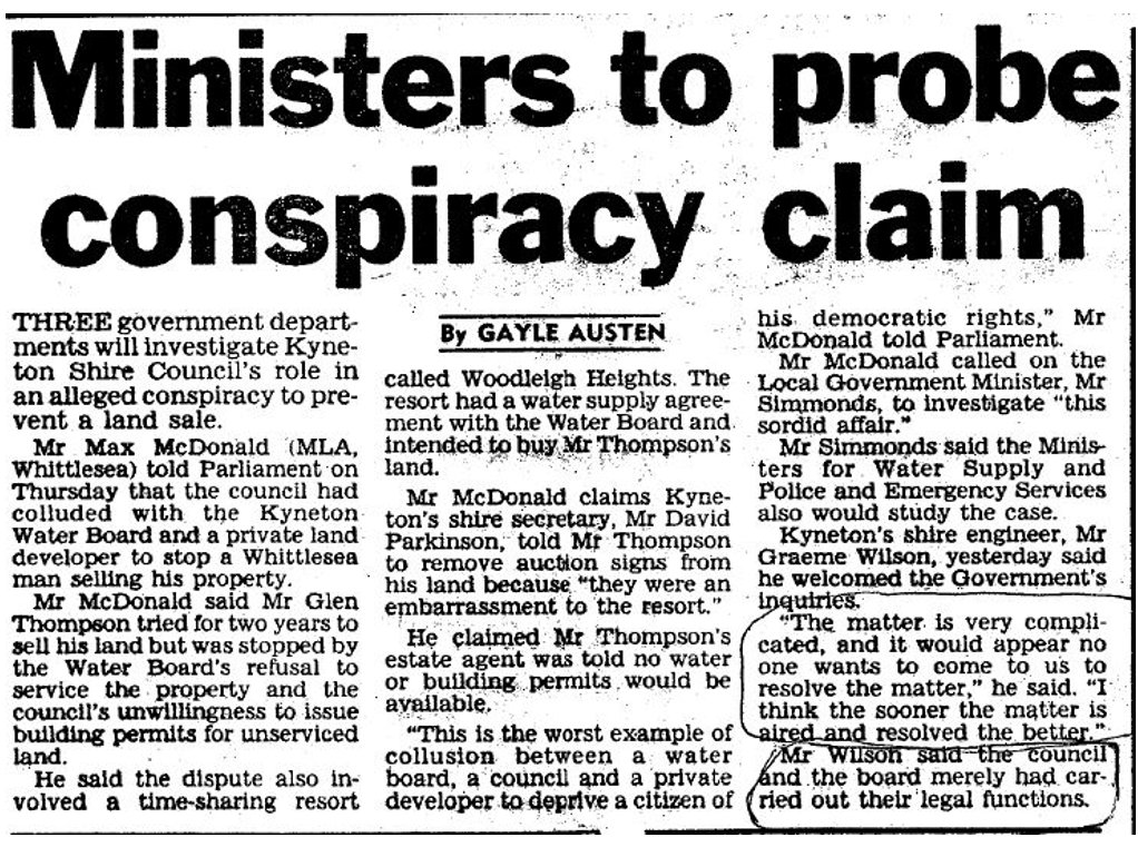 • In the period at least 1979 to the present day the Macedon Ranges shire Council, in its own right and by its predecessor, Kyneton Council, has been engaged in a continuous and uninterrupted course of corrupt conduct. Each and every Councillor in the period 1982 to about 1990 was personally aware of and party to the corrupt conduct. In the period 2010 to the present day each and every Councillor has had the details of the recent and ongoing corrupt conduct placed before them.)