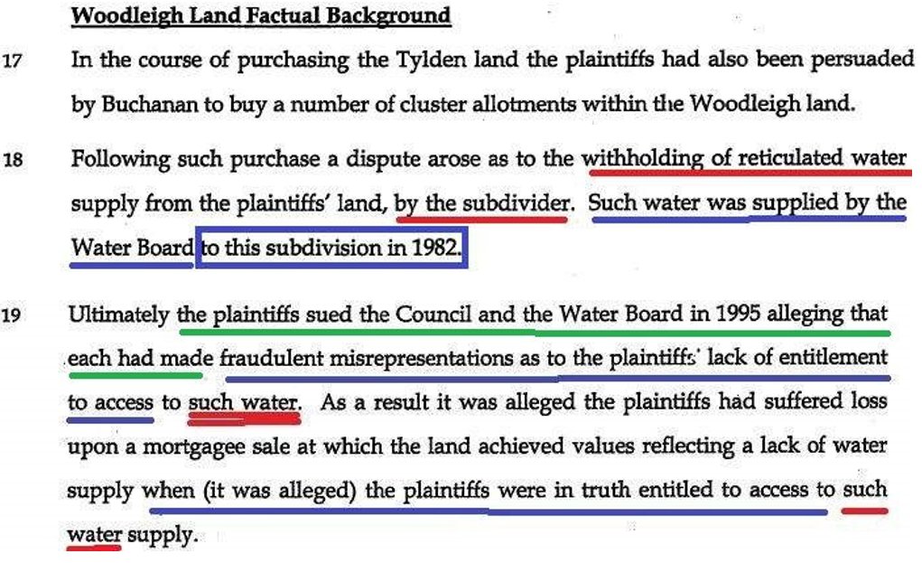 At his paragraphs 17, 18 and 19 Osborn opened the first paragraphs of his Reasons in respect of Woodleigh Heights by firstly setting out what he fraudulently said to be the factual background to the new 2005 proceeding. In those paragraphs Osborn fraudulently represented that my 1995 claim alleged entitlement to the 1982 water supply from the Water Authority.