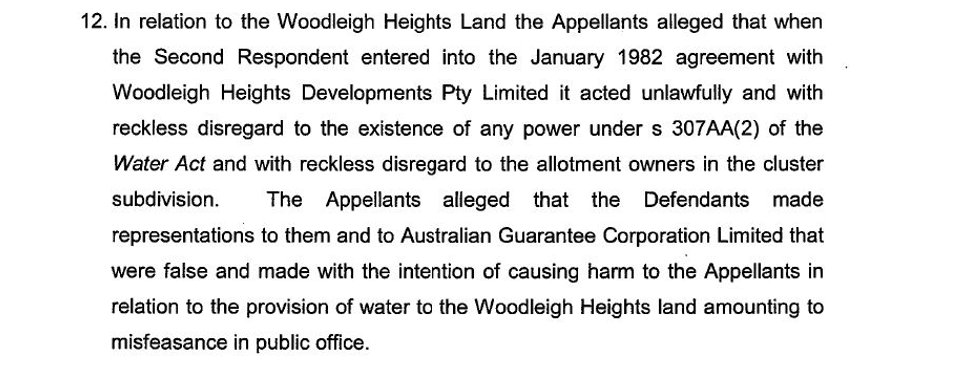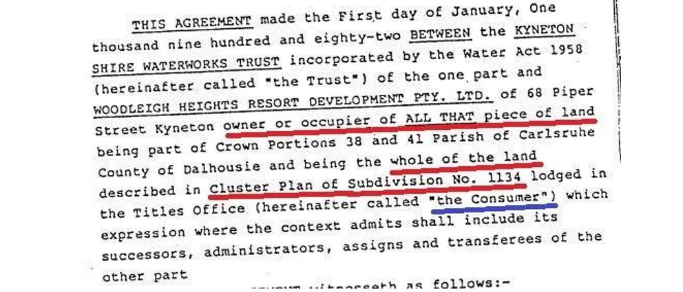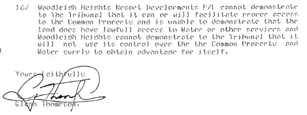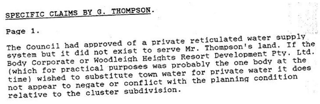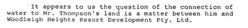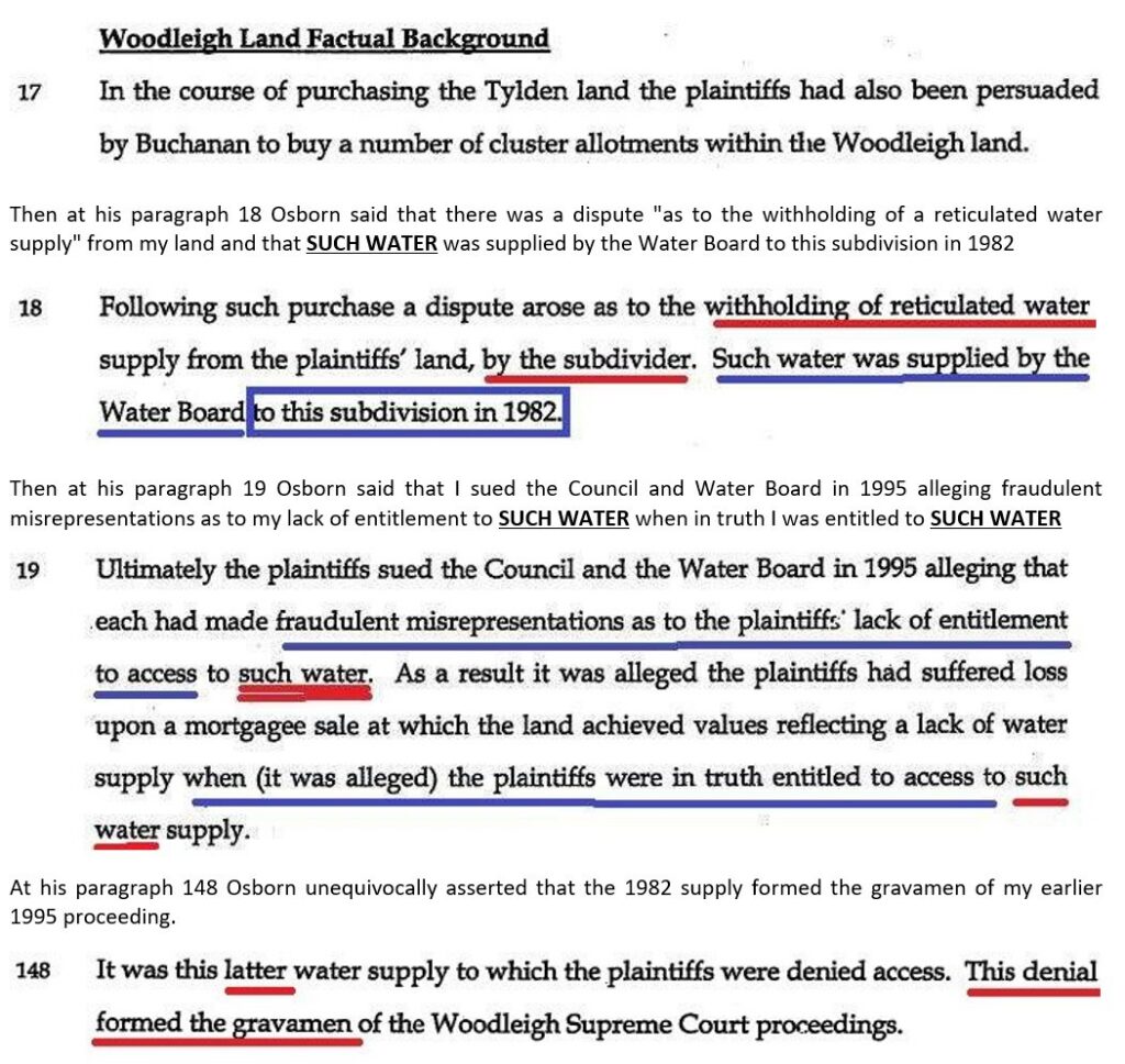 Significantly in his paragraph 166 Osborn fraudulently quoted an excerpt from paragraph 30 of a letter written by me in 1987 and which asserted that the Water Supply Agreement was “for the supply of water to the whole of the Woodleigh Heights subdivision”. (That letter was a letter to the Council.)