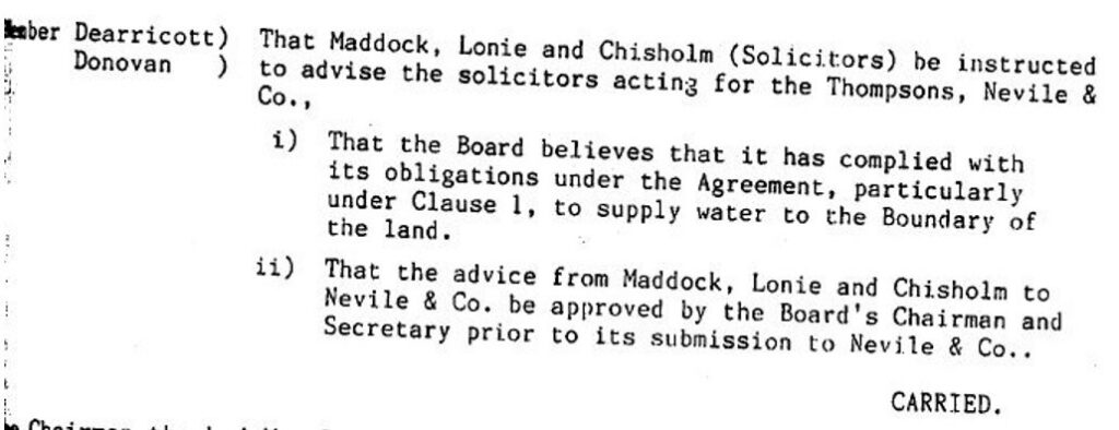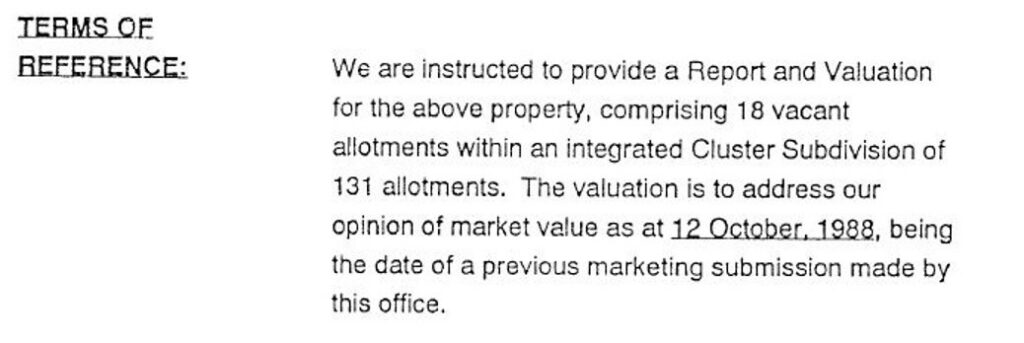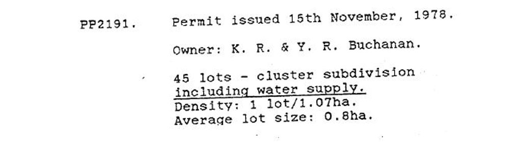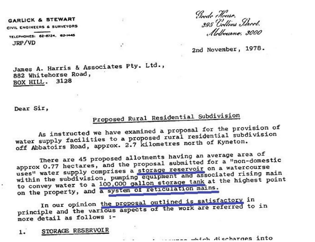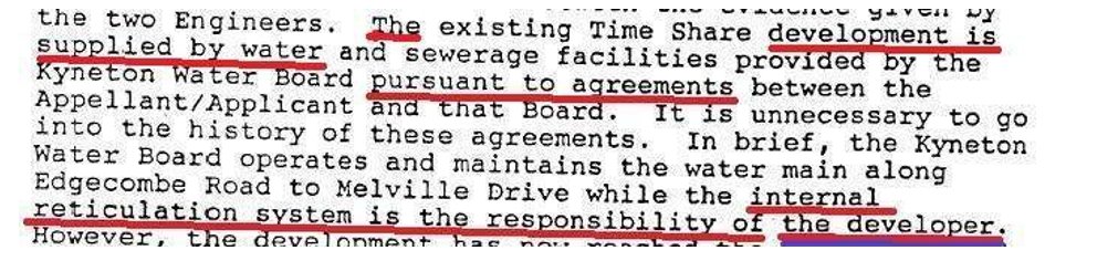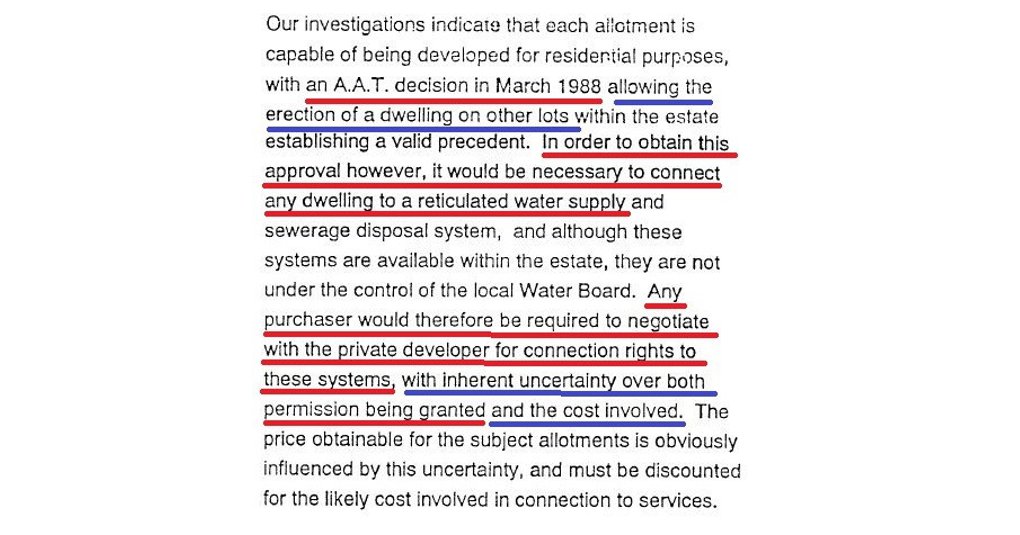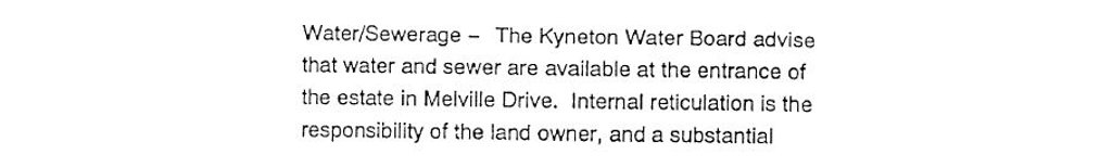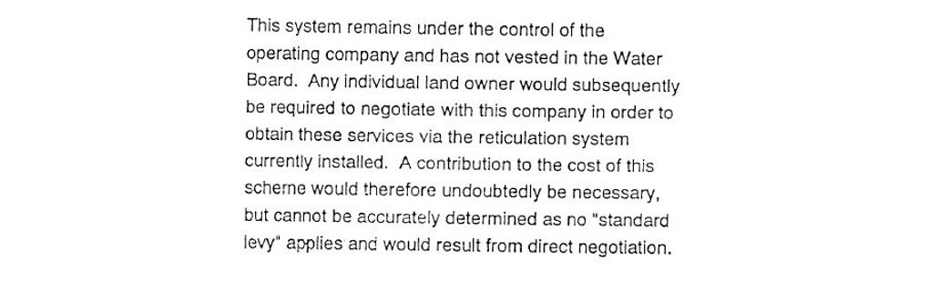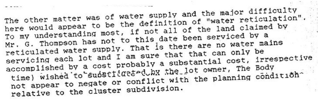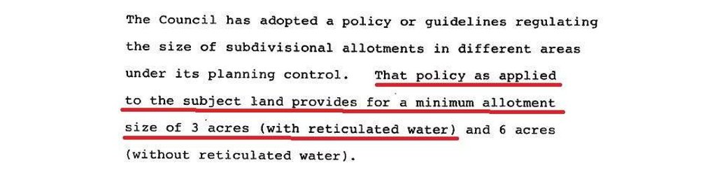 Lonie’s report then described a 1976 subdivision of the land which had allotment sizes of average 7 acres and plainly did not need reticulated water.