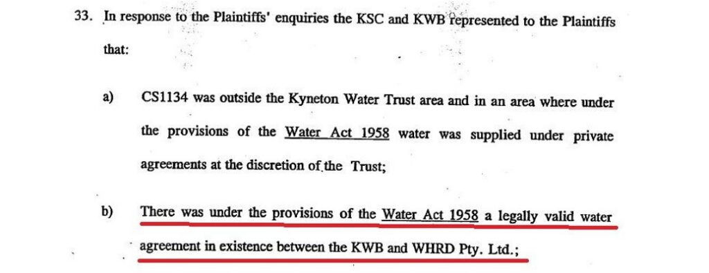 The fact of course was that my submissions were that the 1982 supply and Agreement were each repugnantly unlawful in all respects. I never said or implied potable or implied legitimacy of that water supply or the agreement or that the 1982 supply was to “the Woodleigh land” as distinct from WHRD.