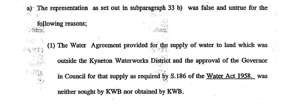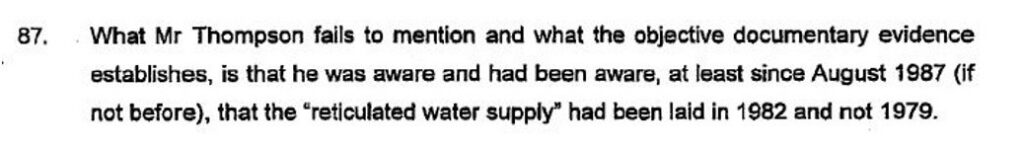 At the time of writing his paragraphs 18, 19 and 21 Osborn was well aware that the 1995 and the 2005 proceedings each related to the private reticulated water supply and NOT to the 1982 supply. Osborn was well aware that the 1982 supply was simply an unlawful supply which no-one had entitlement to and no possible right of action existed in respect of that 1982 supply. The writ in proceeding 7966 of 1995 was issued on 26th October 1995.