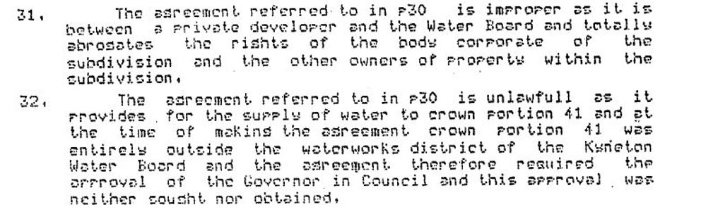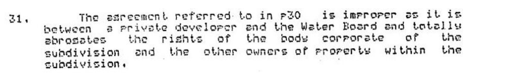 At the time of making that representation Osborn was aware that paragraph 31 of that letter said that the agreement was unlawful. My assertion that the agreement was for supply to the whole of the subdivision was in fact and in context an assertion as to the fraudulent nature of the agreement which fraudulently represented that WHRD “owned or occupied” the whole of CS1134. A copy of my paragraph 31 from that 1987 letter is immediately below.