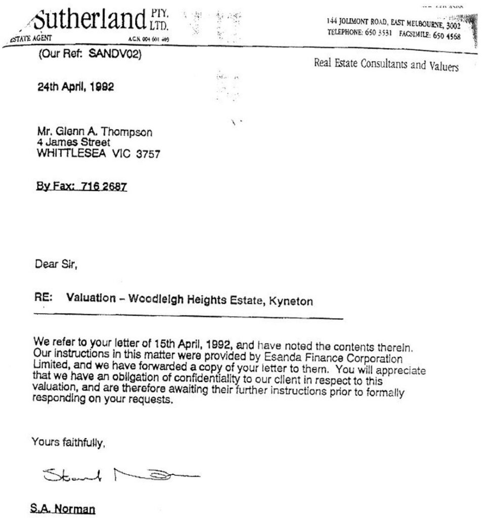 • In 1990, in full knowledge of the fraud and without advertising it for sale and without attempt to maximise offers, my mortgagee, ESANDA, sold my land to a company controlled by the children of a director of the timeshare company and sold it at a price which reflected the fraud.