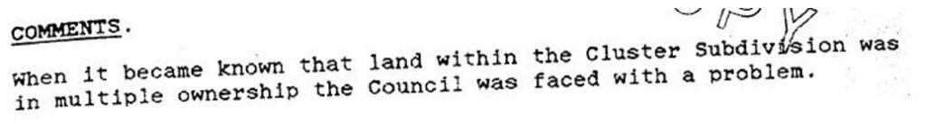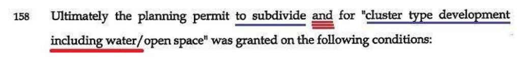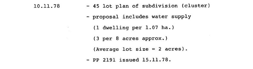 The report then described the 1978 application for cluster subdivision followed by a description which said it had 45 allotments of 2 acres each and a lot density of 1 allotment per three acres and then the report said that one of the conditions of “that development” required water to be provided by a large on-site dam and internal reticulation where the words “that development” were an obvious reference to the cluster subdivision and not a separate component as Osborn fraudulently represented.