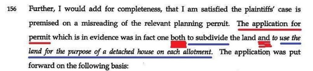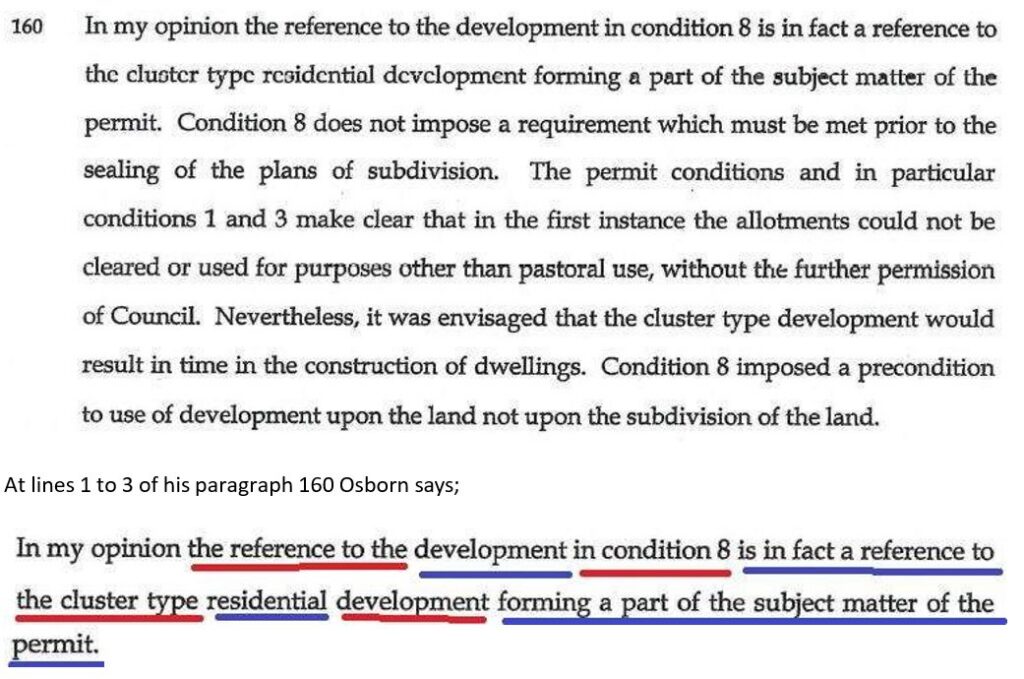 Here Osborn introduces his alphabet soup term “use of development upon the land” which is a bumbling attempt to use the word “use” in his rendition of the application and the word “development” of his rendition of the Planning Permit in one term or phrase so as to purport to relate the two.