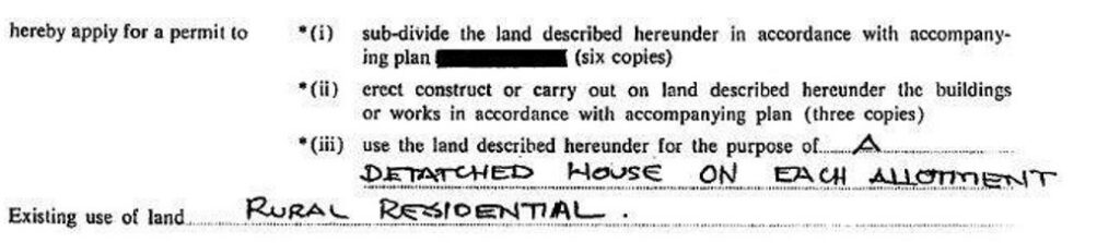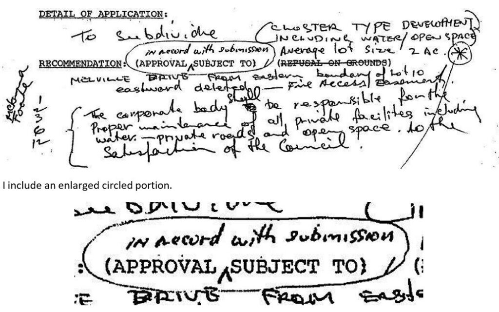 To provide verisimilitude to his fraud Osborn denied that the subdivision was subject to Council’s Policy with respect to allotments sizes and water supply. Compare now Osborn’s paragraph 157 with the 1988 submissions set out immediately below. In the face of the facts Osborn simply fabricated whatever was necessary to his fraud. Osborn’s paragraph 157 was derived from transcripts which he set out at his paragraph 156 and implied to be from the “application for permit”. He in fact selectively transcribed from the submission which he was seeking to deny and which in fact gave the lie to his assertions.