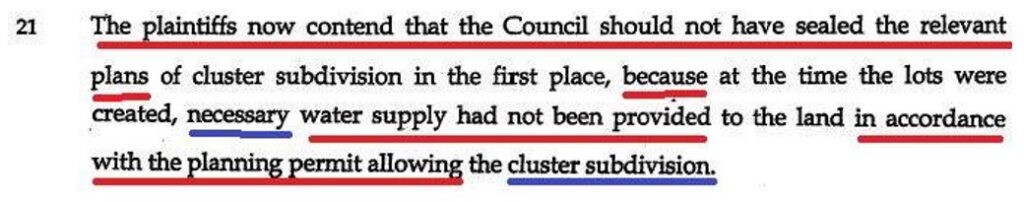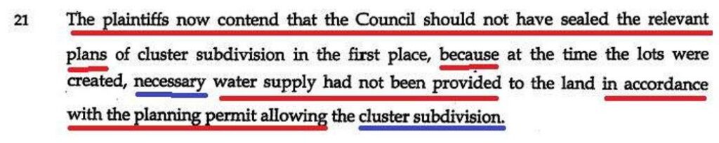 Then at his paragraph 21 Osborn fraudulently said that my new 2005 proceeding alleges that the Council should not have sealed the plans of cluster subdivision because NECESSARY water supply had NOT been provided in accordance with the planning permit allowing the cluster subdivision.