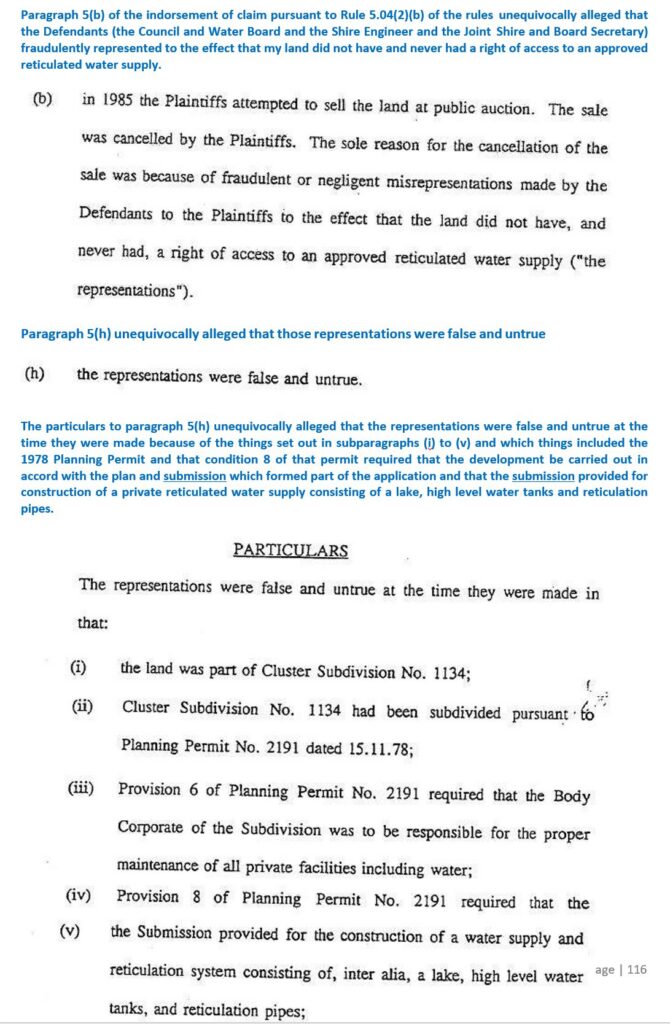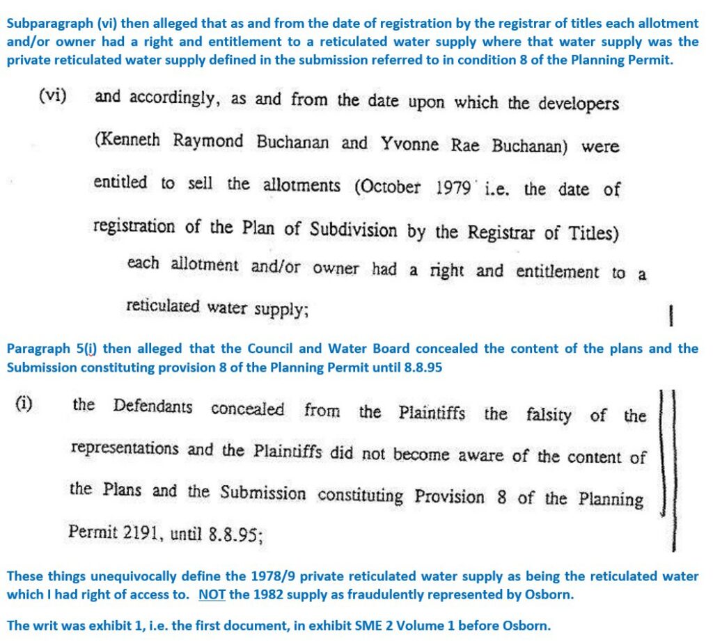 2. secondly as demonstrated below the 1995 proceeding unequivocally alleged entitlement to the private reticulated water supply defined in the submission and Osborn also knew full well that no possible right of action existed in respect of that unlawful 1982 water supply and none was pleaded and it is not possible to construe the 1995 gravamen as fraudulently asserted by Osborn.