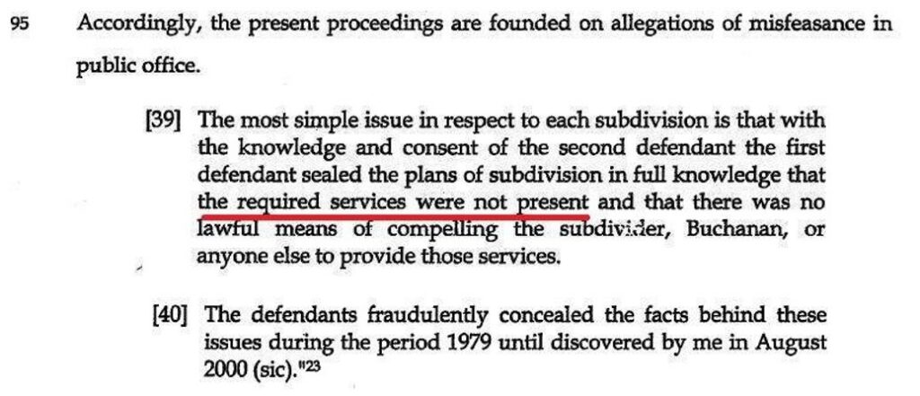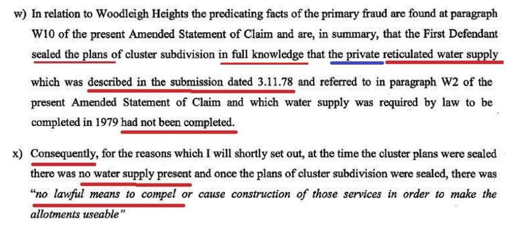My paragraphs 42(w) and (x) defined the specific factual matters giving rise to the Woodleigh Heights gravamen. These paragraphs unequivocally defined the private reticulated water supply and said that it was required by law to be completed in 1979 but had not been completed and there was no lawful means of compelling provision of that supply in order to make the allotments usable.