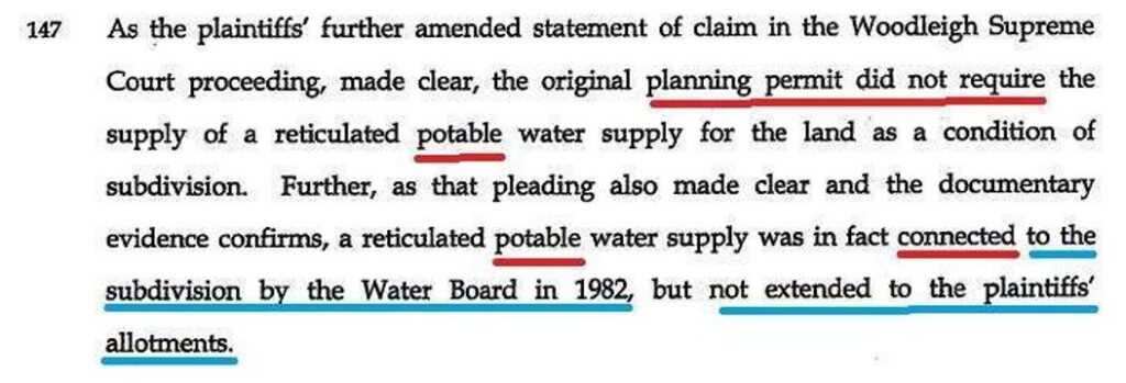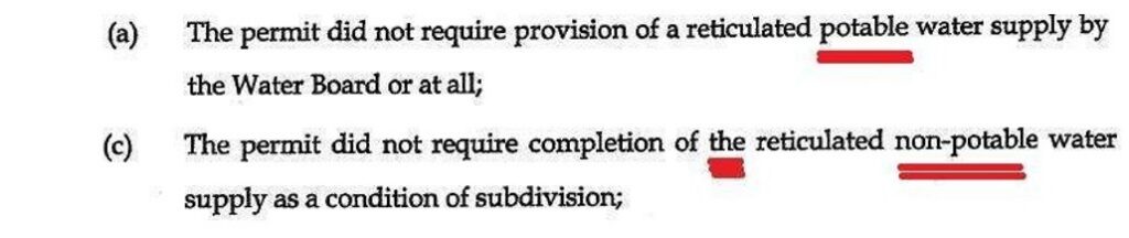 In his paragraph 147 Osborn said the obvious fact that the planning permit did not require a potable water supply. He then fraudulently represented that the Water Authority connected a potable water supply “to the subdivision” in 1982.