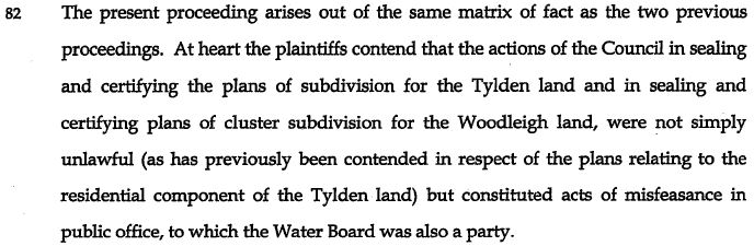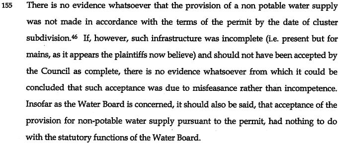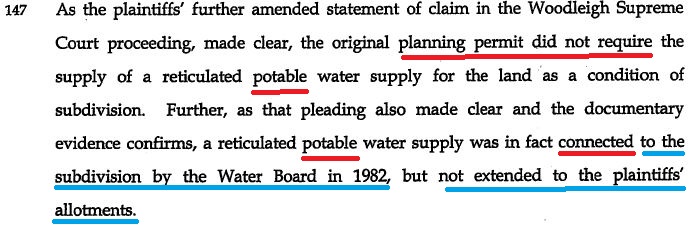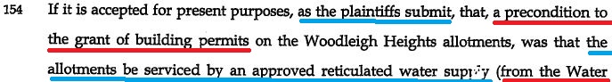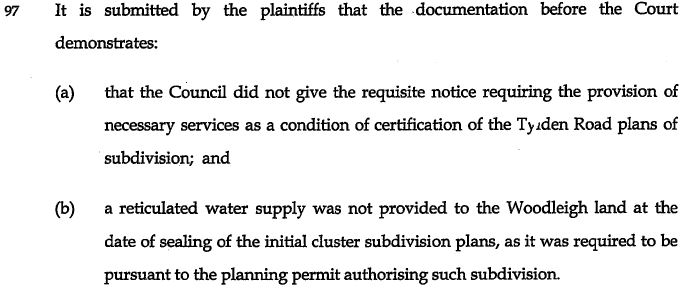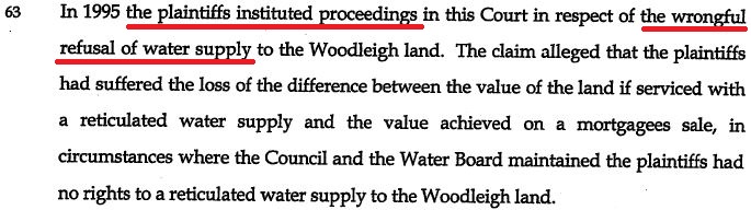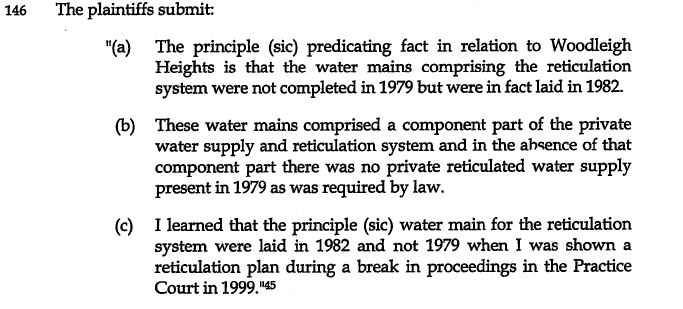 The phraseology of Osborn’s paragraph 21 is a carefuly misleading rendition which asserts “water supply”, this diverts attention from the true root of the 2005 gravamen in respect to Woodleigh Heights which was that the water mains were not laid in 1979 as required by law.