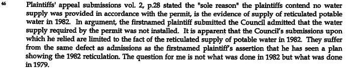 Knowing full well the distinction between the two supplies and that the question related to the reticulation main and not the water supply Delany and Garde’s written submissions to Master Efthim were that I was aware since 1987 that “the reticulated water supply had been laid in 1982 and not 1979“.  The cunning obfuscation being that water is supplied, reticulation pipes are “laid“.  They knew full well that knowledge of the illegal 1982 water supply imparted no knowledge at all of the 1979 supply and particularly not of the reticulation system and could not because all knowledge of the fact and facts of the 1979 water supply and reticulation system were concealed from me until 1995 and the fact that the reticulation system had not beein “laid” was further concealed until 1999.