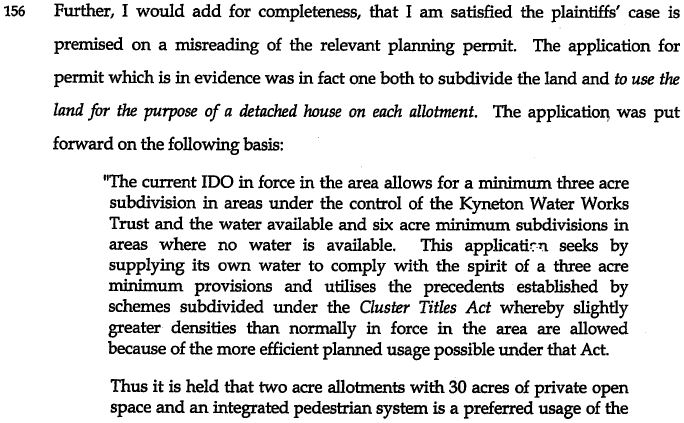 Buchanan applied to the Council for a planning permit in 1978, at that time the land was in an area where council’s planning policy was a minimum lot size of 6 acres without a reticulated water supply and a minimum of three acres with a reticulated water supply. (see page 6 of Council’s written submission to the Planning Appeals Tribunal – full submission here)