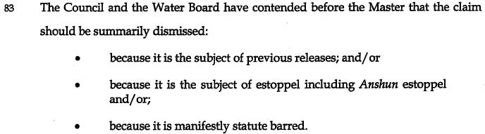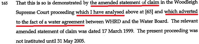 I referred to this paragraph above — so according to Osborn the Amended Statement of Claim in the 1995 proceeding “adverted” to the 1982 water supply agreement.  Well it did so over twenty six pages and extensively and unequivocally set out the unlawful nature of the agreement and the water supply provided in purported pursuance.