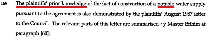 • Fourthly an extensive letter authored by me and dated 24th August 1987 is selectively quoted by Osborn at his paragraph 169. The paragraphs he fails to quote extensively set out the unlawful nature of the 1982 Water Supply Agreement and Water supply. I will deal with this aspect and make the letter available when I discuss Osborn’s paragraph 169 below.