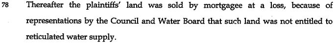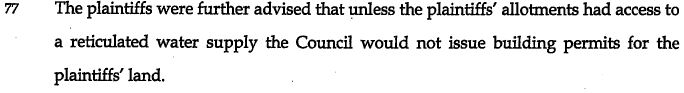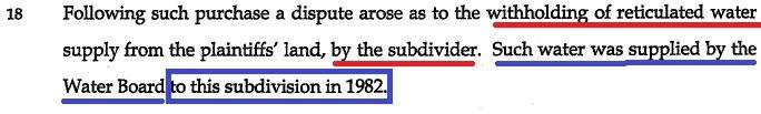 • Thirdly, paragraphs 6 to 14 of the 1995 Amended Statement of Claim clearly precisely and uneqivocally describe the “private reticulated water supply” and my entitlement to that supply and that the representations of the Council and Water Authority to the effect that I/my land was not entited to a reticulated water supply were false and untrue.