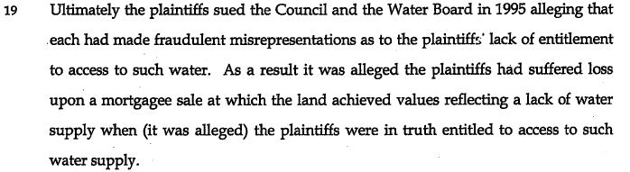 • The twenty six pages over which the 1995 Amended Statement of Claim “adverts” to “the fact of a water agreement between WHRD and the Water Board” the Amended Statement of Claim describes extensively the corrupt and fraudulent conduct of the Council and Water Authority and now described in Chapter 8 hereof and in particular Chapter 8 part 5 hereof.  The 1995 Amended Statement of Claim extremely extensively “adverts” to the said water agreement if that is not an oxymoron.  (complete 1995 Amended Statement of Claim available here)