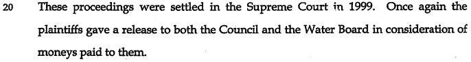 Settlement of that 1995 proceeding occurred in the most unsatisfactory circumstances described in Chapter 8 part 6. During the subsequent proceeding in the Practice Court as discussed in Chapter 8 part 6A the solcitors for the Council and Water Authority disclosed a reticulation plan which demonstrated and disclosed that the reticulation system, the water mains had not been laid as required by law in 1979 but were instead laid in 1982 by WHRD.  This important and most discoverable document had been concealed by the Council and Water Authority and their lawyers for the entire period in which the 1995 proceeding remained in foot.