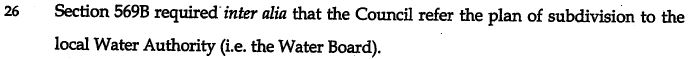 569B(2)(ac) of the Local Government Act only required this if the subject land was in the district of the Authority and in the case of the Woodleigh Heights subdivision it was not within the said district and could not be supplied by the Water Authority so the Council did not refer the plans and was not required to refer them. (see paragraph 11 of the 1995 Statement of Claim and paragraph 11 of the Council’s Defence)  (see also Chapter 8 part 5 for alteration to Water Districts).