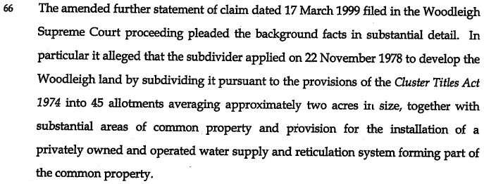 • Fourthly, the 1995 Amended Statement of Claim “adverts” to the fraudulent 1982 water supply and water supply agreement for twenty six pages and extensively describes and alleges all of the dishonest and fraudulent conduct of the Council and the Water Authority and Woodleigh Heights Resort Developments P/L in repect to that water supply and water supply agreement and specifically details all of the reasons why the Water Authorities representations that the water supply and water agreement were lawful were in fact fraudulent misrepresentations and that the Council and Water Authorities representations to the effect that I/my land was not entitled to a “reticulated water supply” were false and untrue beacause of the matters and things set out at paragraphs 7 to 14 of that 1995 Amended Statement of Claim, namely that I/my land was entitled to the 1979 private reticulated water supply defined at paragraphs 7 to 14 of that Amended Statement of Claim.